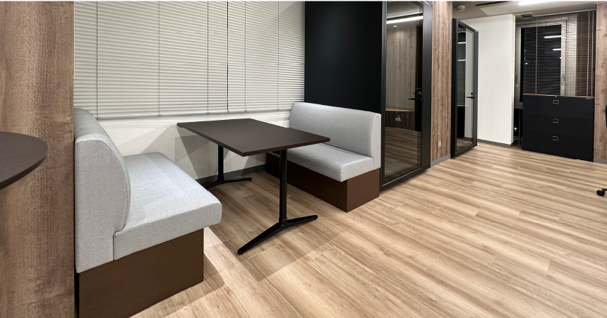 コミュニケーションエリアは個室ブースやカフェ席など、必要に応じて選択できる席を複数設置。全席の家具や建具に取り入れられた、落ち着きのある暗色と木目が、実直な企業カラーの演出にも一役買っています。