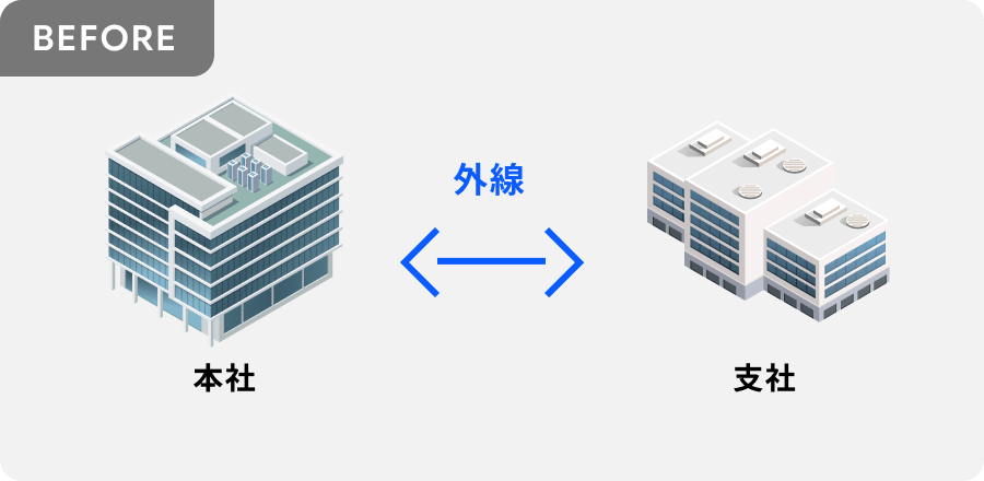 導入前は、各拠点に物理的な主装置(PBX)を設置し、電話線が届く範囲でしか内線化ができませんでした。そのため、拠点ごとに高額な主装置の導入コストがかかる上、拠点間の通話はすべて外線扱いとなり高額な通話料金が発生していました。さらに、拠点ごとの煩雑な設備管理と設定変更が、情報システム部門の大きな負担となっていました。
